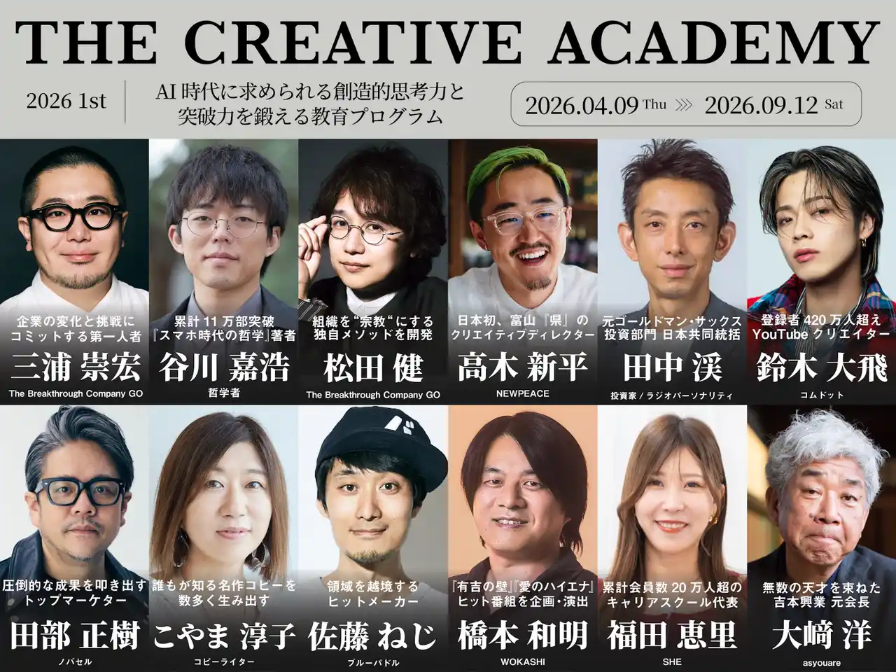 「THE CREATIVE ACADEMY」は、AI時代に求められる“創造的思考力”と“突破力”を鍛える教育プログラムです。 この度、2026年4月より開講する「THE CREATIVE ACADEMY 2026 1st」の講師として、橋本和明氏並びに大崎洋氏が追加決定いたしました。 |