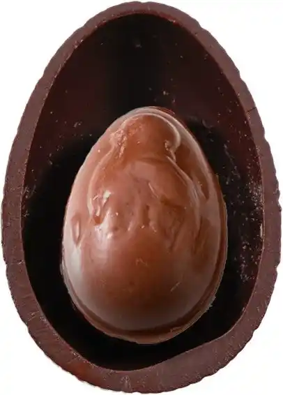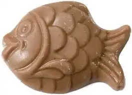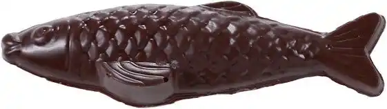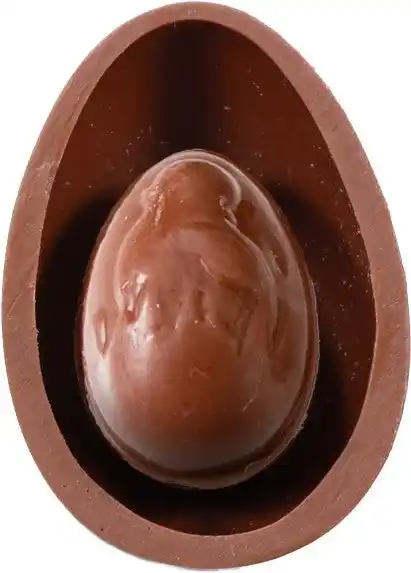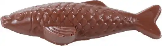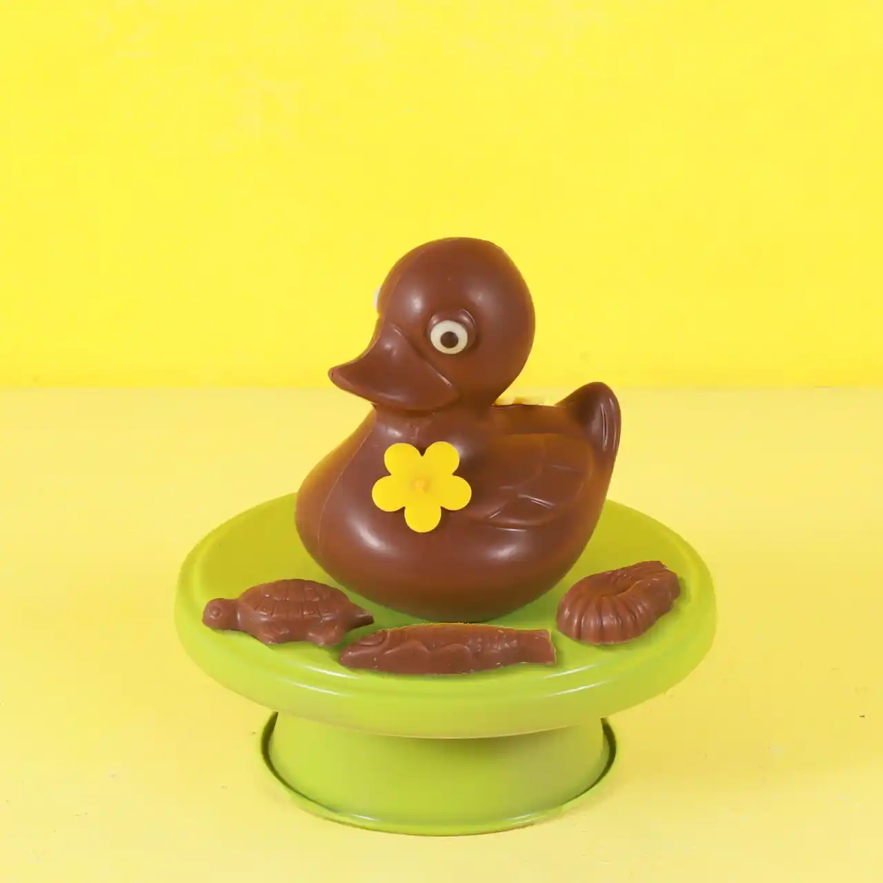 チョコレートでつくられたアヒル。中には、イースターのモチーフである魚や海の生き物をかたどった「フリチュール」が3個入っています。 |