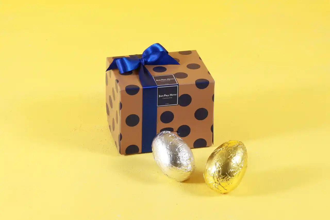 ひとつずつ職人の手で作り上げたイースターの卵、「ウフ レ ドレ」(ゴールド/ミルクチョコレート)と「ウフ ノワール アルジャンテ カメルーン」(シルバー/ビターチョコレート)を各1個詰合せ。 |