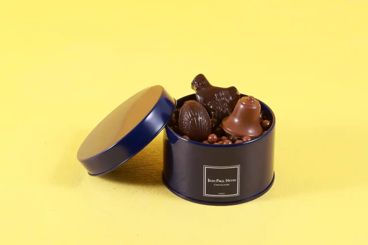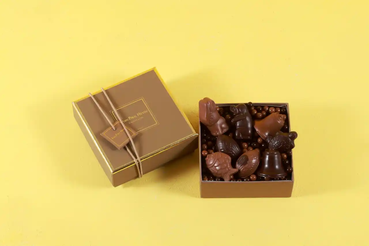 「クロッシュ」、「ウフ」、「アニモ」を各1個ずつと「ペルル クラッカントゥ ショコラ メランジュ」の詰合せ。教会の鐘が運んできたイースターの卵を探す動物をイメージ。 |