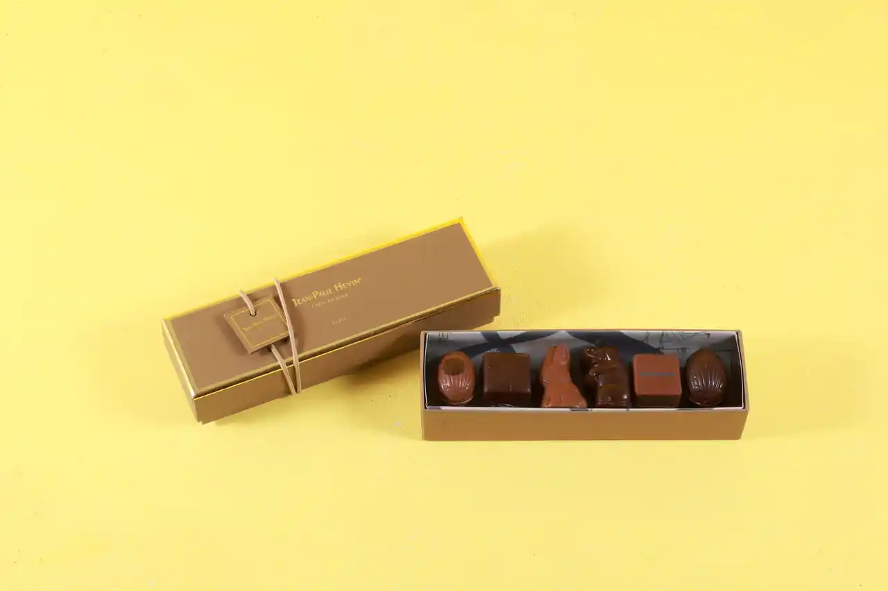 卵形の「ウフ」、動物をかたどった「アニモ」、鐘をモチーフにした「クロッシュ」、海の生き物をかたどった「フリチュール」、「ペルル クラッカントゥ ショコラ メランジュ」の詰合せ。 |