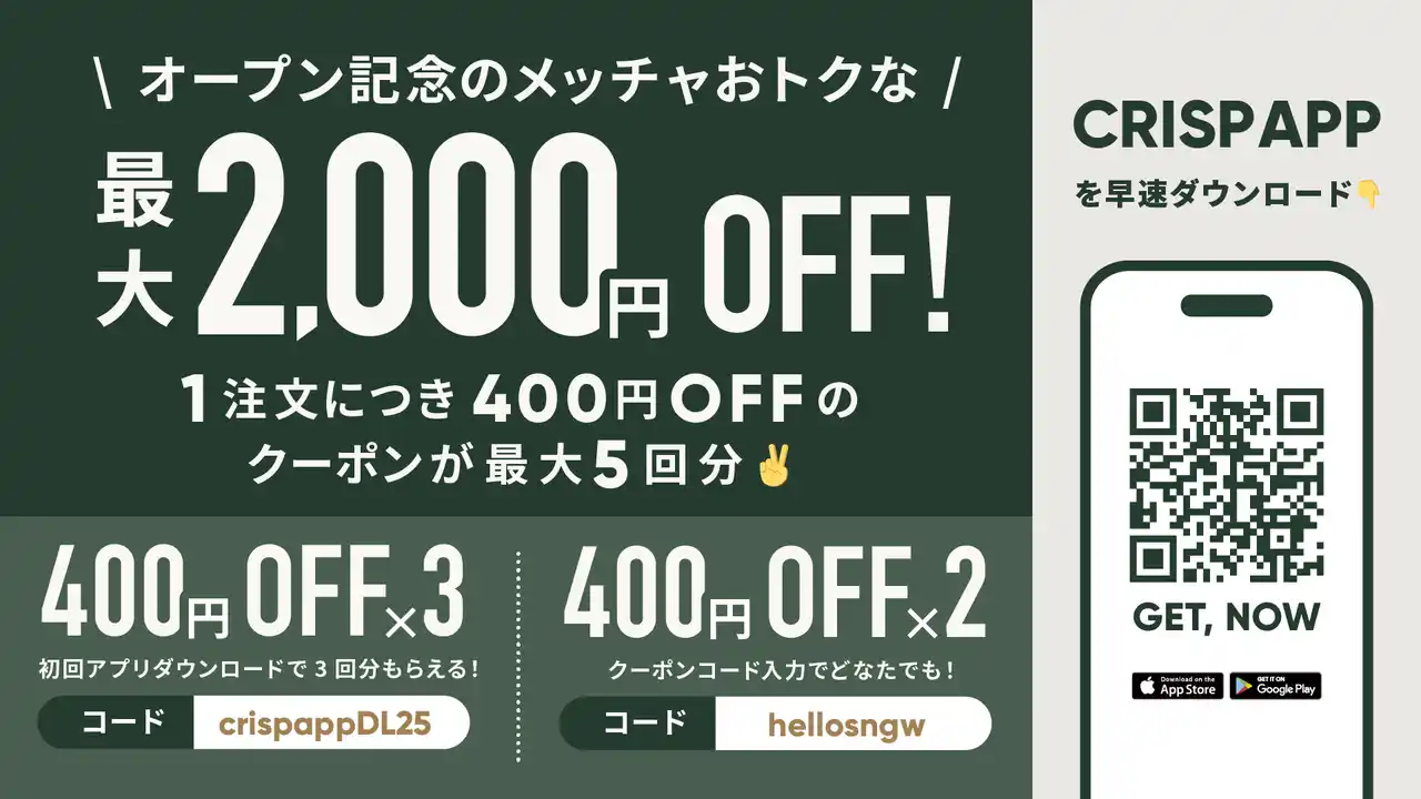 【品川インターシティ店オープン記念クーポン】 最大2,000円(400円×最大5回分)OFF 1. 初回アプリダウンロードクーポン(400円OFF×3回分) ・コード crispappDL25 ・利用期限 2026年4月30日(木)まで ※こちらのクーポンは期間延長または早期終了する場合があります ・利用回数 期間内に3回利用可能 ・利用条件 初めてアプリをダウンロードした方限定 全店舗で利用可能 キッズサラダ・サイド・ドリンク利用不可 |