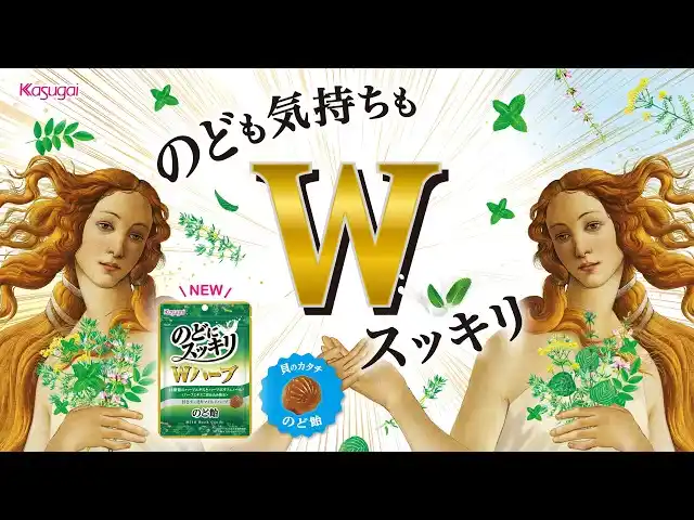 2人の女神で“W”を表現し、「のどにスッキリ Wハーブ」の特徴を歌いながらキャッチーに伝える商品紹介動画を作成しました。本動画は「のどにスッキリ」公式ブランドサイトのほか、Web広告でも順次展開予定です。 |