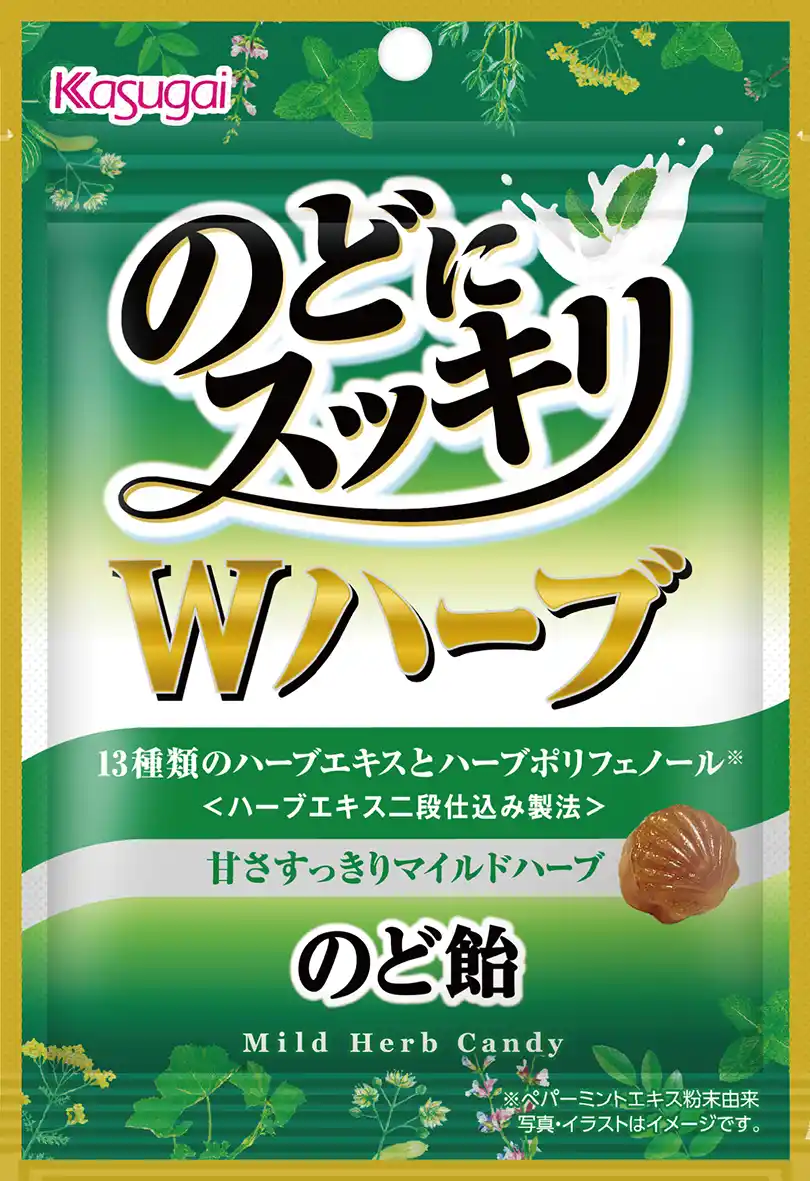「のどにスッキリ」ブランドから、強化版のど飴として2026年2月23日に全国発売された「のどにスッキリ Wハーブ」。こだわりの13種類のハーブエキスとハーブポリフェノールのWハーブ原料。そしてハーブエキス二段仕込み製法を採用しました。通常品より小粒な貝のカタチで、ミルクでやさしくうるおいつつすっきりとした甘さのマイルドハーブ味が特徴です。 |