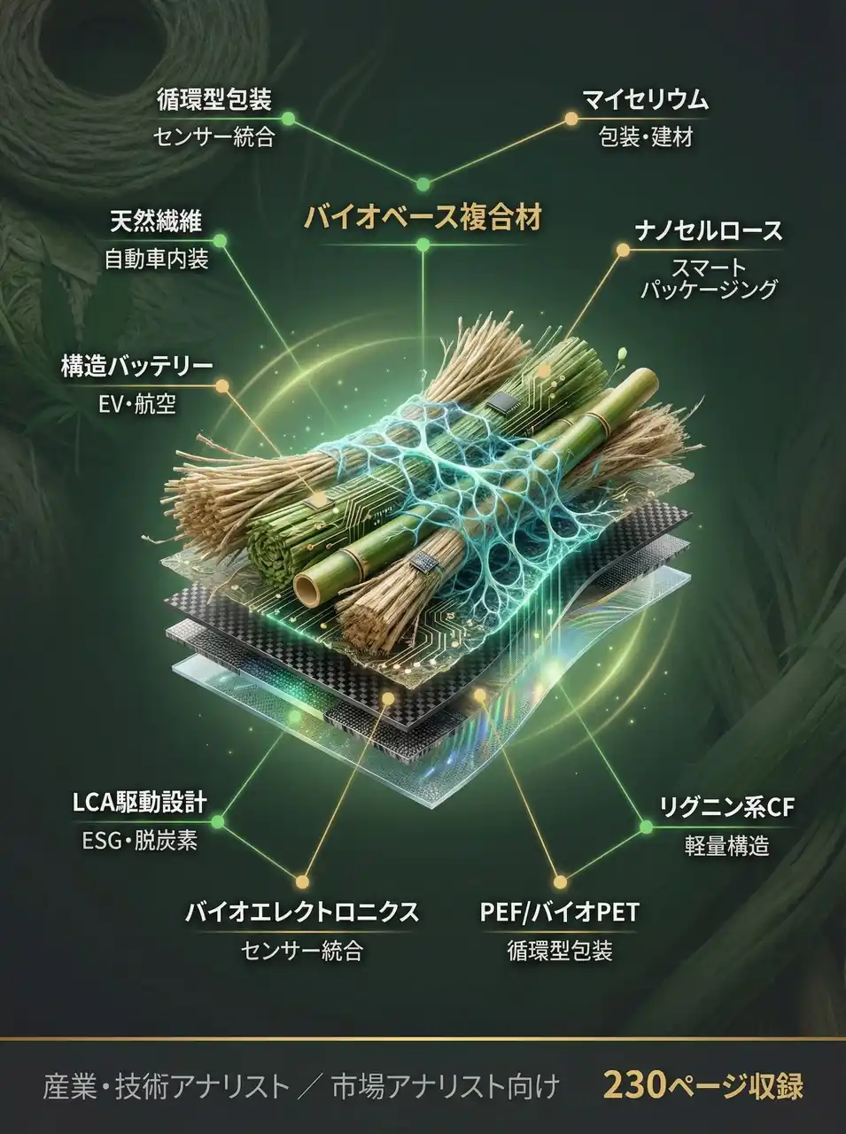 構造バッテリーコンポジット・マイセリウム複合材・ナノセルロース強化材・天然繊維コンポジットなど、次世代バイオ素材の技術全容を40テーマにわたり網羅している。 |