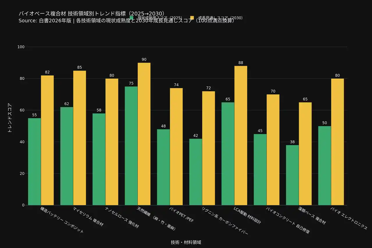 天然繊維複合材(麻・亜麻・ケナフ)の自動車内装・構造部材への本格展開、バイオPET/PEFの食品包装~電子機器筐体への拡大、バイオコンクリートのインフラ・建築規格取得が主要テーマとなる。LCA統合設計を標準プロセスに組み込み、「低CO2グレード」として顧客提案する体制の整備が競争優位に直結する。 |