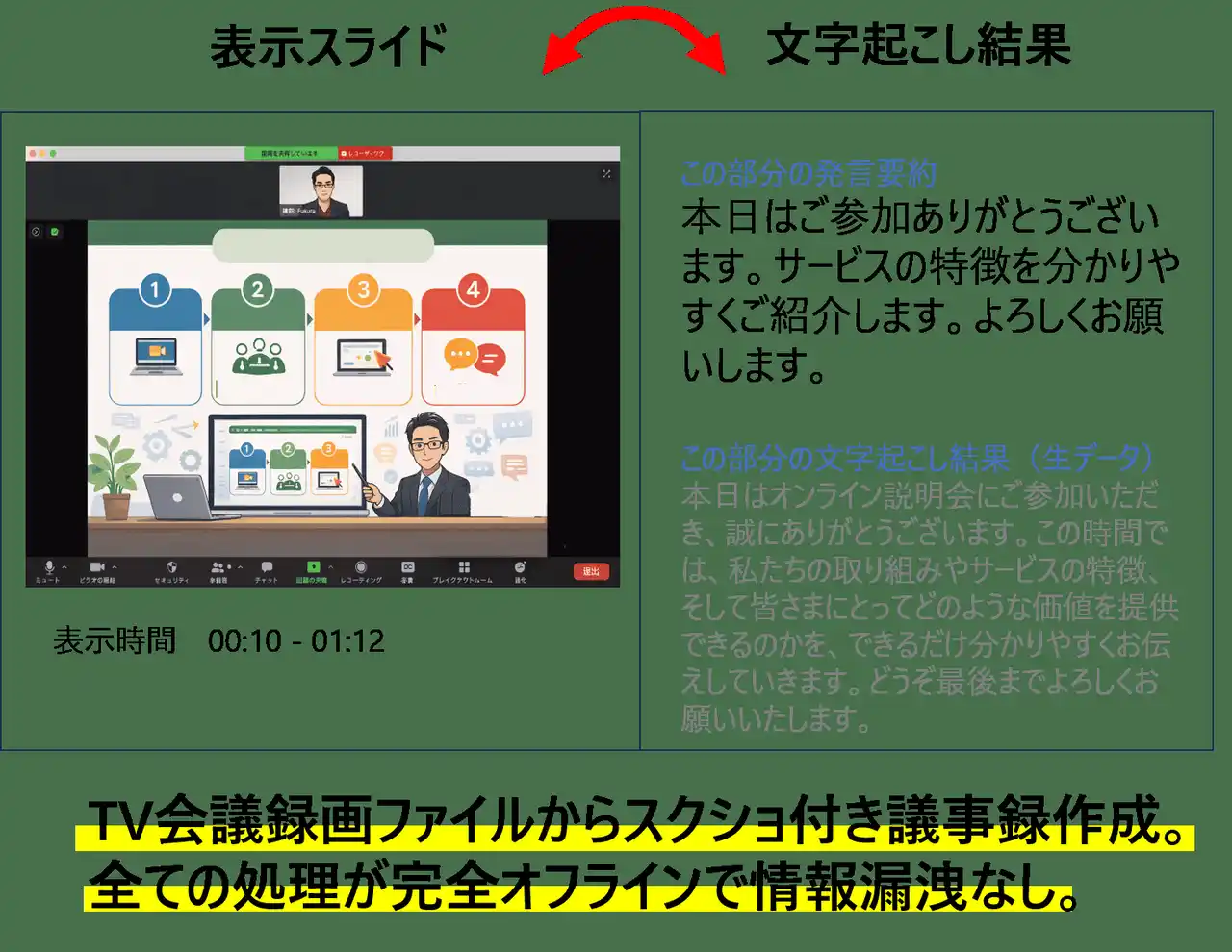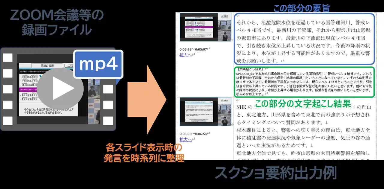 ZoomなどのTV会議を録画したmp4ファイルを投入すると、音声認識による文字起こしやAI要約結果に加え、スライド画面のスクリーンショットと発言内容を対応表示させた議事録を自動生成します。 |