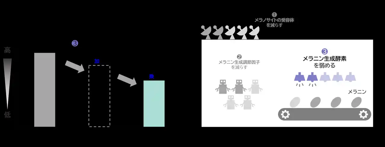 本研究では、複数の細胞が発するメラニン生成に関わるシグナルが、メラノサイトの特定の受容体に集約されることに着目しました。「ホワイトティー」は、この受容体を減少させるとともに、調節因子や酵素のはたらきを抑制することで、メラニン生成シグナルを包括的に弱めることを見出しました。さらに6種類の植物と組み合わせることでメラニン生成酵素に対する効果が相乗的に高まることを示しました。これらのトリプル効果は、メラニン生成が始まる初期段階を捉えた新たなアプローチを示すものであり、美白研究のさらなる発展につながる知見であると考えています。