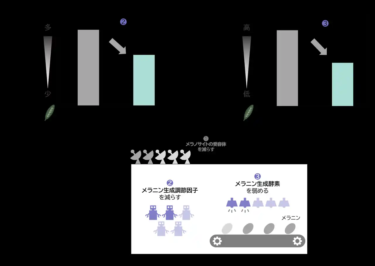 メラニンの生成は、表皮細胞や血管細胞が発するシグナルを、メラノサイトが受け取ることで開始されます。このシグナルを詳しく分析し、両者に共通するシグナル因子と、それを受け取るメラノサイトの受容体にたどり着きました。複数の細胞からのシグナルが1つの受容体に集まることから、この受容体がメラニン生成シグナル調節における効果的なターゲットであると考えられます。