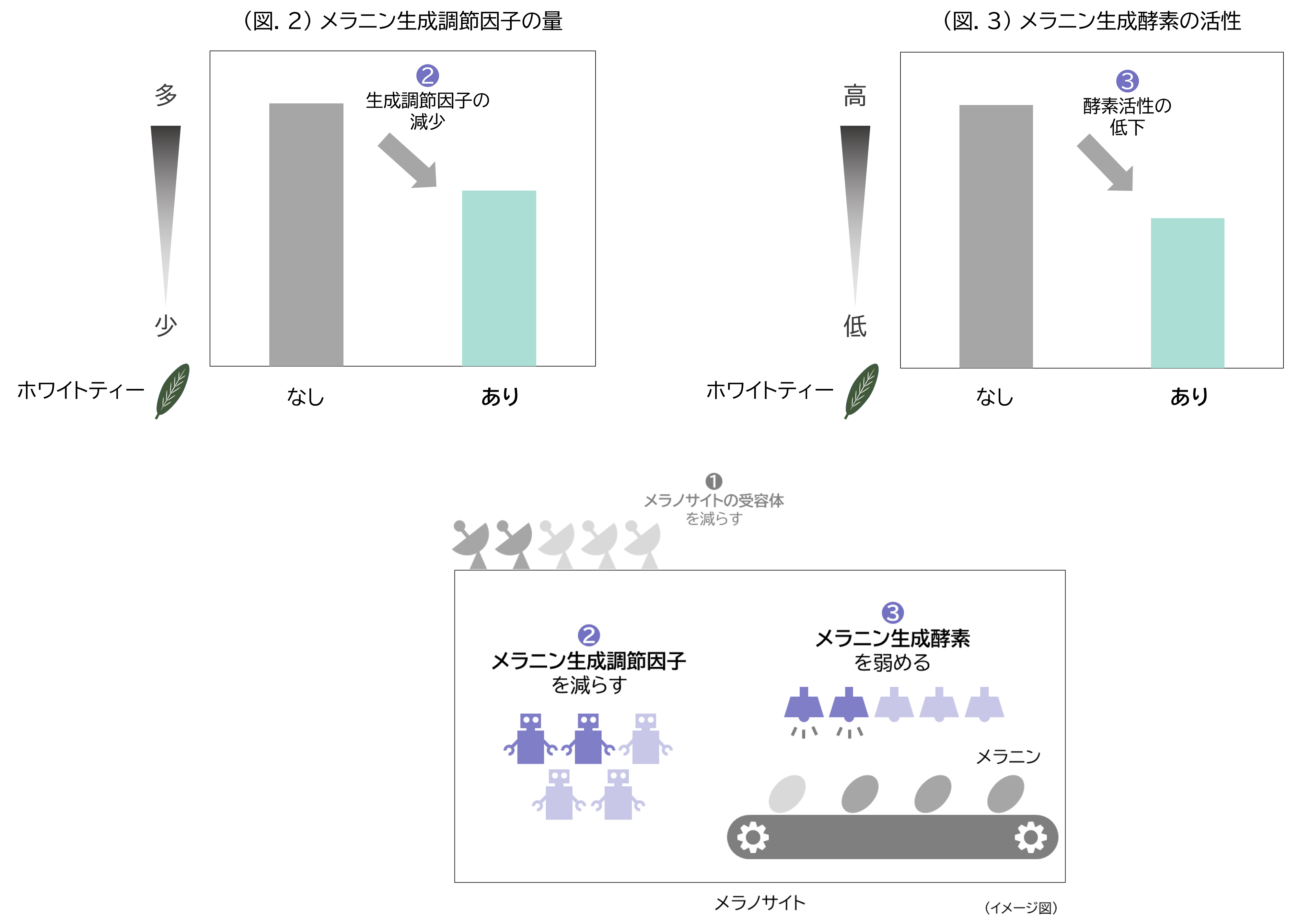 (図.2)メラニン生成調節因子の量/(図.3)メラニン生成酵素の活性