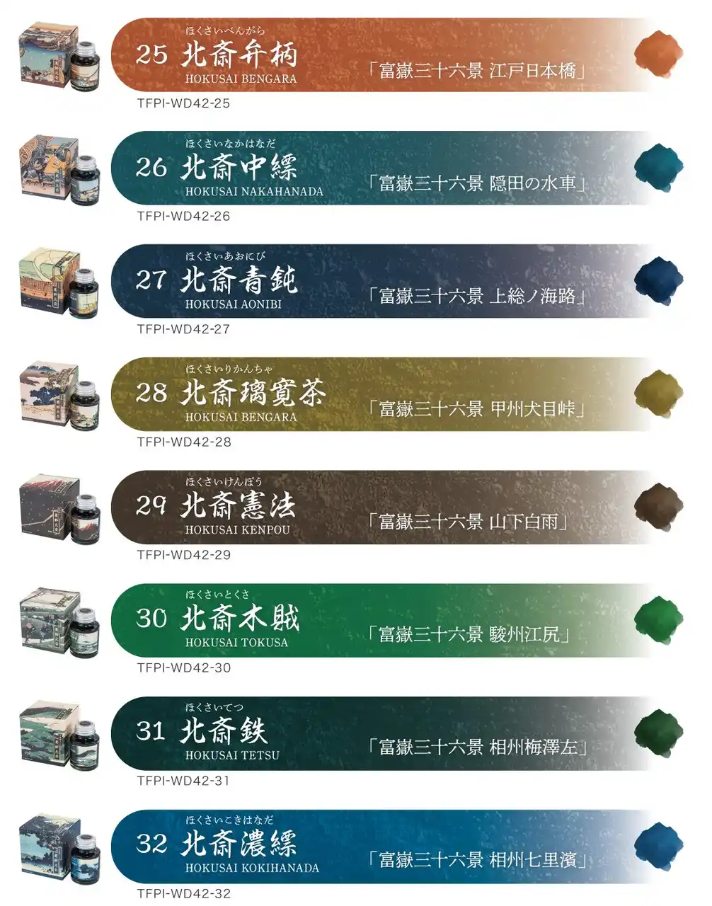 (25)北斎弁柄 / (26)北斎中縹 / (27)北斎青鈍 / (28)北斎璃寛茶 / (29)北斎憲法 / (30)北斎木賊 / (31)北斎鉄 / (32)北斎濃縹 |