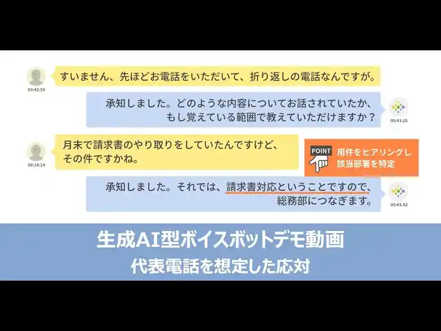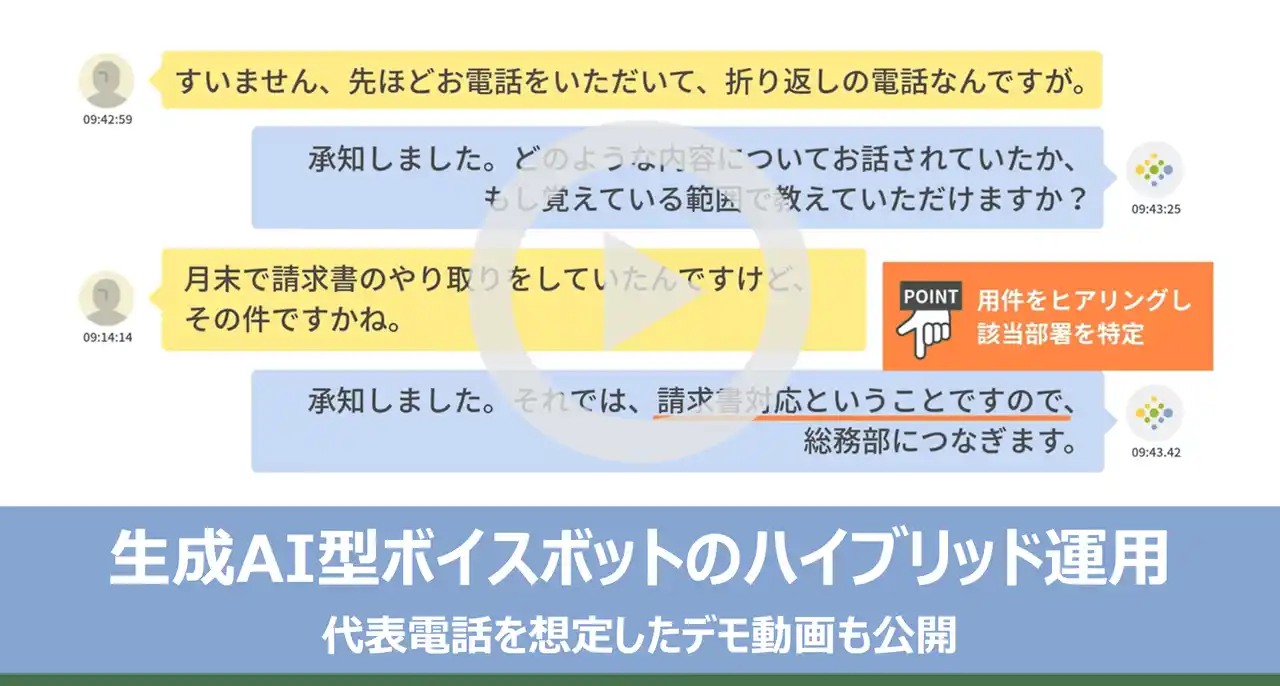 本機能のリリースに伴い、ハイブリッド型の一例として、企業の代表電話窓口を想定した会話デモ動画を公開しました。 |