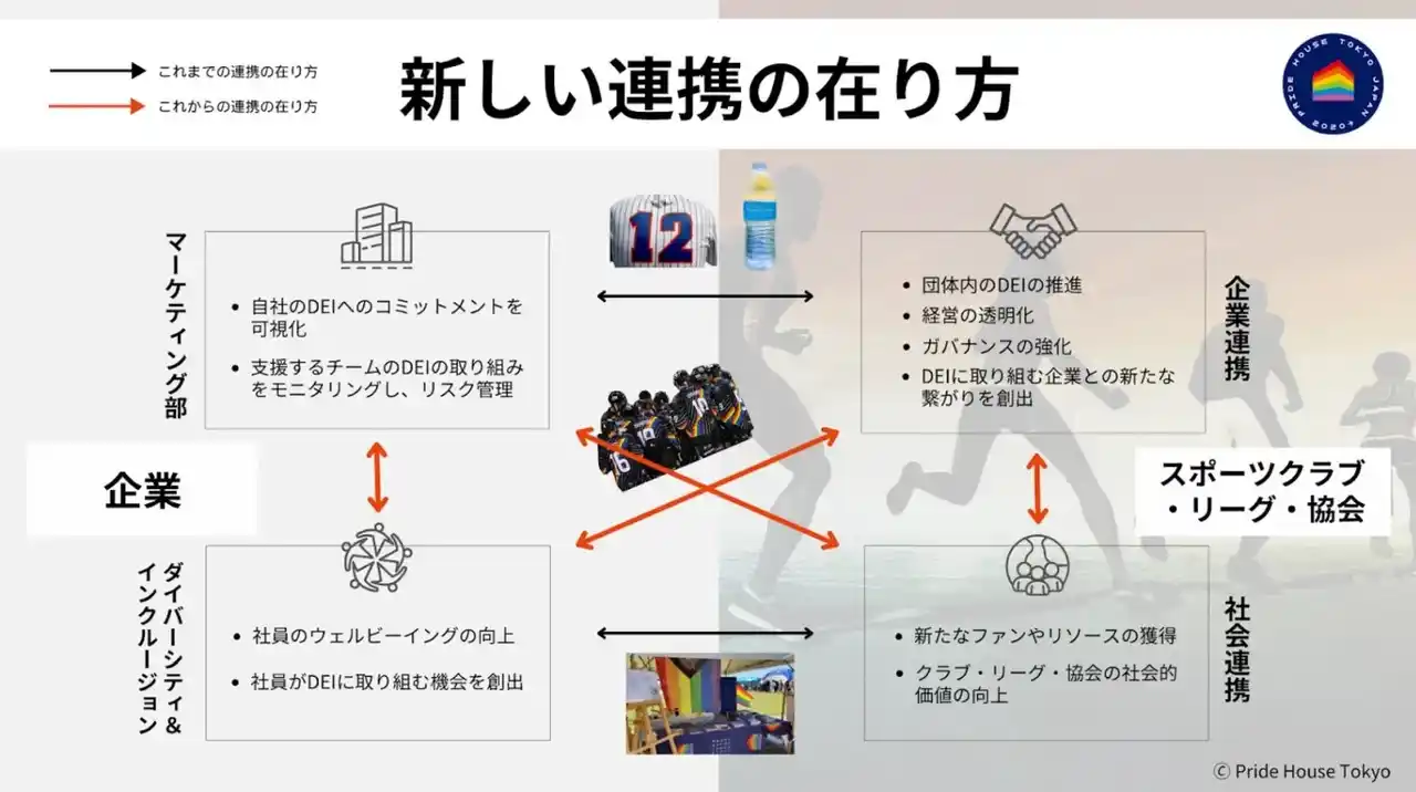 このような状況のなか、スポーツ分野のインクルーシブとクラブ・リーグ・企業の持続可能な発展に向け、スポーツ業界の新たなDEI指標として「スポーツ版PRIDE指標(仮称)」の開発が2024年11月に発表されました。本指標は、スポーツクラブ・リーグ・協会と、その活動を支えるスポンサー企業との新しい連携スタイルを提案するもの。双方が組織全体を通じて横断的に連携することでDEIが可視化され、協賛先のリスク管理や、行政と連携した新規事業開発にも資する指標になることが見込まれます。