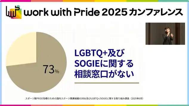 プライドハウス東京が2025年4月にスポーツ団体を対象に調査を実施したところ、DEIが進んでいないスポーツ業界の実態が浮き彫りとなりました。「LGBTQ+およびSOGIEに関する差別禁止方針がありますか」という問いに「ない」と答えた組織が63%、相談窓口の設置有無に関しても73%が「ない」と回答。また「PRIDE指標の存在を知っている」については90%が「知らない」と答え、スポーツ業界のDEIへの取り組みが非常に遅れていることが改めてわかりました。 |