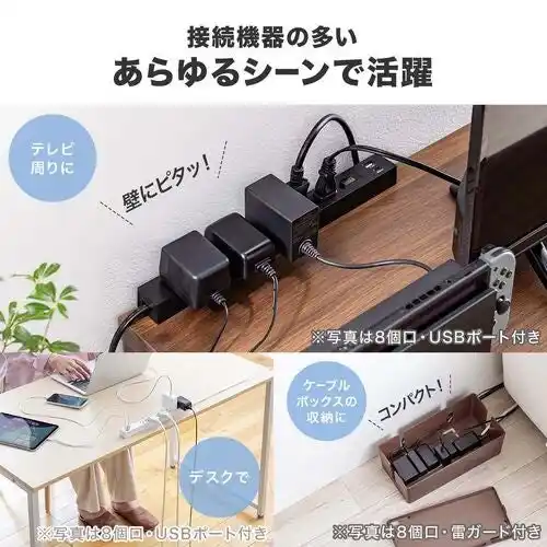 | 本体は約3cmの薄型スリム設計で、省スペースに設置できます。デスクの隙間やテレビボード、キッチンのカウンターなど、限られたスペースでも邪魔になりません。シンプルなブラックデザインはオフィスや家庭のインテリアにもなじみやすく、あらゆる環境で使いやすい電源タップです。 | |||||||||||