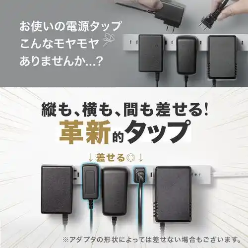| 本製品最大の特長は、縦・横・間のどこからでも差し込める独自の差込口構造です。従来の電源タップではACアダプタ同士が干渉して隣のコンセントが使えないことがありましたが、本製品なら差し込み方向を柔軟に調整できるため、スペースを無駄なく活用できます。ノートパソコンやモニター、充電器など、ACアダプタが多い環境でもストレスなく接続できる設計です。 | |||||||||||