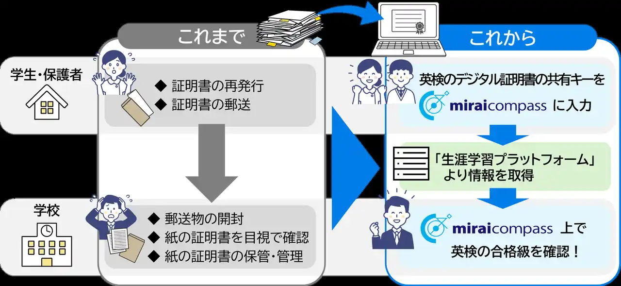 このような動向や課題に対し、DCSのインターネット出願サービス「miraicompass」と入試において英検のデジタル証明書の活用を推進してきた「生涯学習プラットフォーム」の連携により、受験生と学校双方にとって効率的で安全な入試手続きを実現します。 |