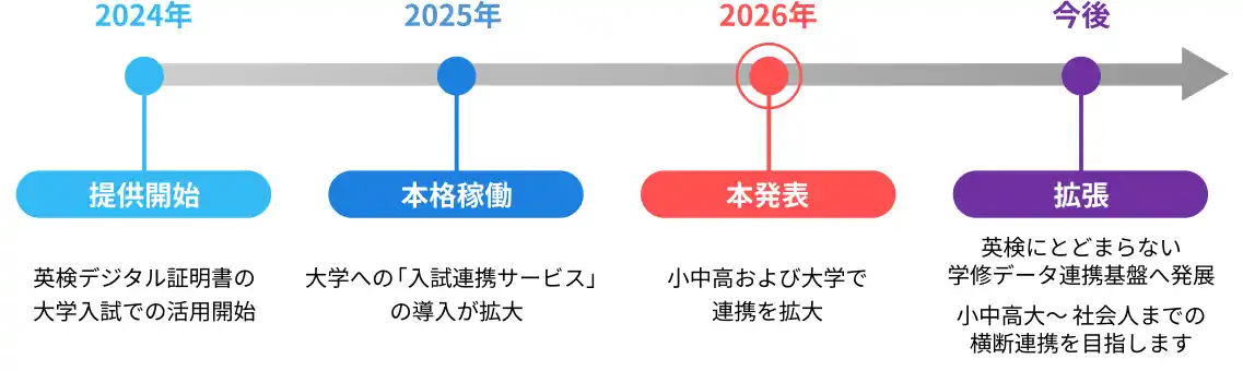 今後は、英検の合格やSCEスコアの証明にとどまらず、出願・就学時に必要となる各種証明書のデジタル化と認証の連携を強化し、教育現場のさらなるDXを推進します。また、進路検討段階での学修データの活用を通じて、学習者の意思決定、生涯学習を支援していきます。 |
