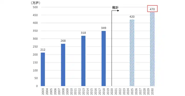 国土交通省『空き家政策の現状と課題及び検討の方向性』では、将来推計と増加抑制のまとめに、「その他空き家数の将来推計について、直近のトレンドによると、2025年(令和7年)で420万戸、次期住生活基本計画の成果指標目標年となる2030年(令和12)で470万戸程度と推計。」 |