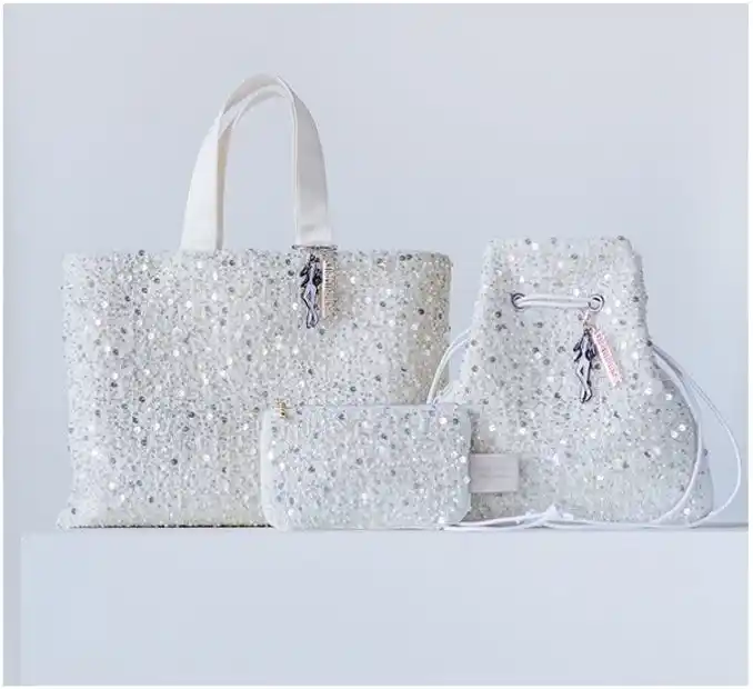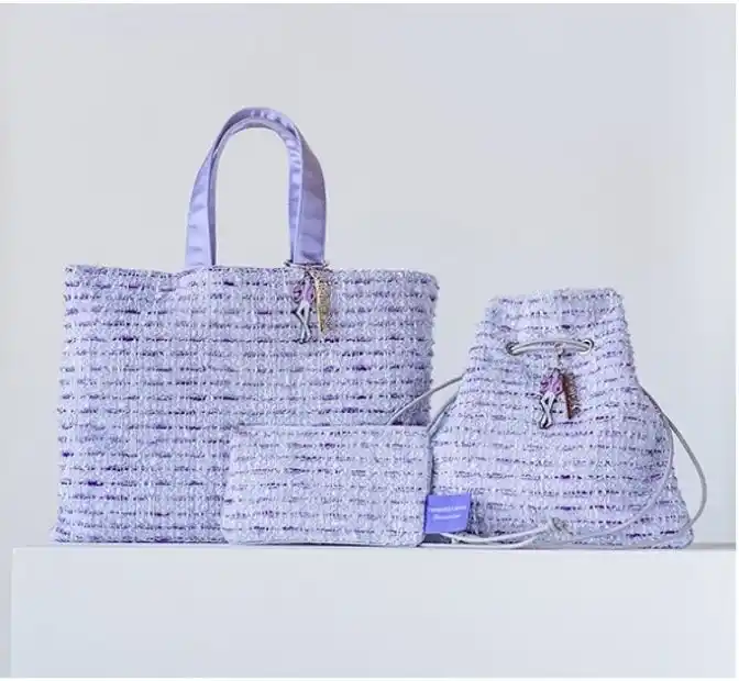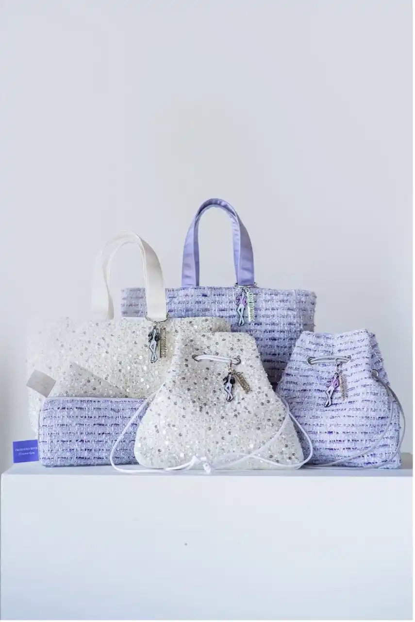 今回のコラボレーションでは、宝塚歌劇の華やかな舞台衣装をイメージさせるパールやスパンコールをあしらったホワイトのツイード生地と、宝塚らしい“すみれの花”をイメージした優雅なパープルツイード生地の2種を展開。トートバッグ、巾着バッグ、フラットポーチの各3アイテムをラインアップしました。 |