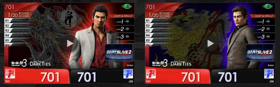 ダーツライブのオンラインマシン「ダーツライブ3」「ダーツライブ2」にて、コラボゲーム『龍が如く』501を期間限定で展開いたします。プレイ条件を満たした方を対象に、デジタルコンテンツをプレゼントします。 |