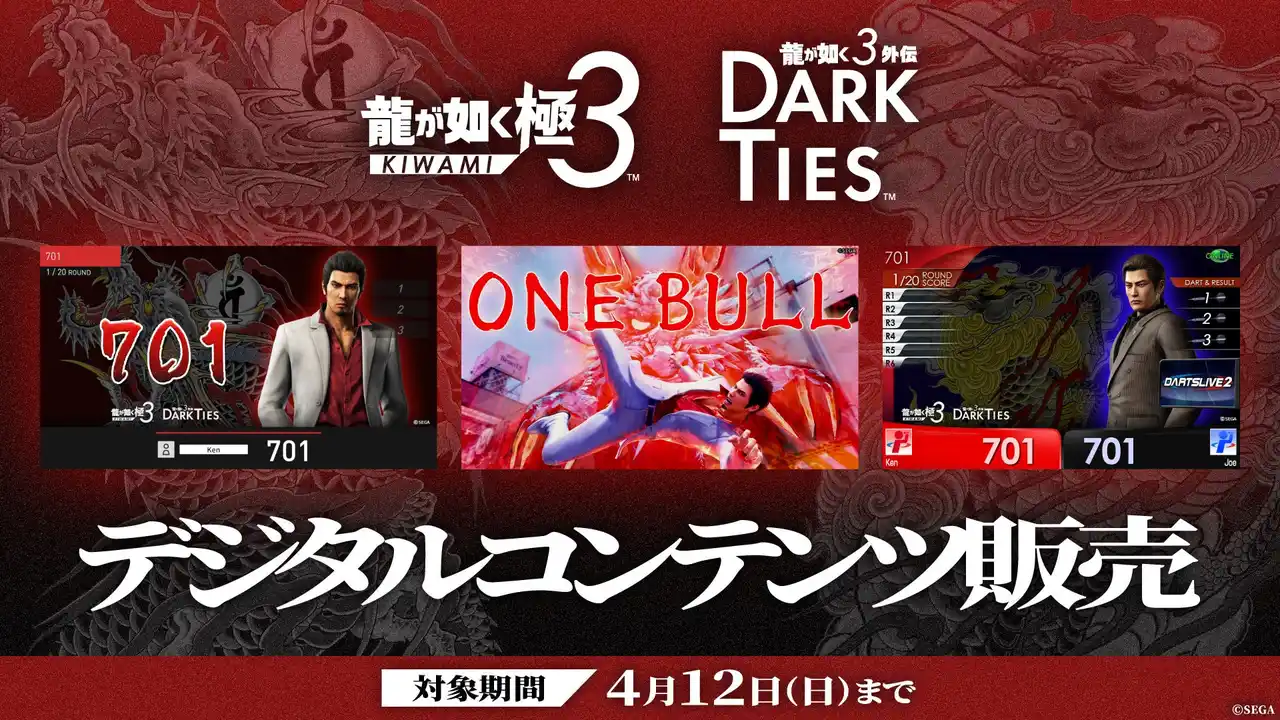 セガサミーグループの株式会社ダーツライブ(本社:東京都品川区、代表取締役 社長執行役員:阿部 東)は、2026年3月16日(月)より「ダーツライブ×『龍が如く 極3 / 龍が如く3外伝 Dark Ties』コラボキャンペーン」を実施いたします。 |