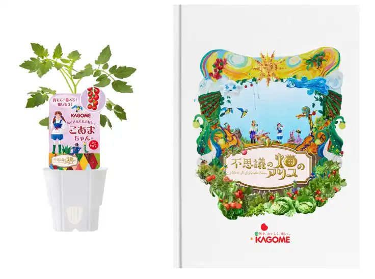 「アリスとめぐる畑のひみつツアー」を体験いただいた方に、ご自宅で栽培いただける「トマトの苗」や、「不思議の畑のアリス」の絵本をプレゼントいたします。また、抽選カウンターでは、「トマトの収穫体験」や、「カゴメの野菜飲料」が当たる抽選にご参加いただけます。 |