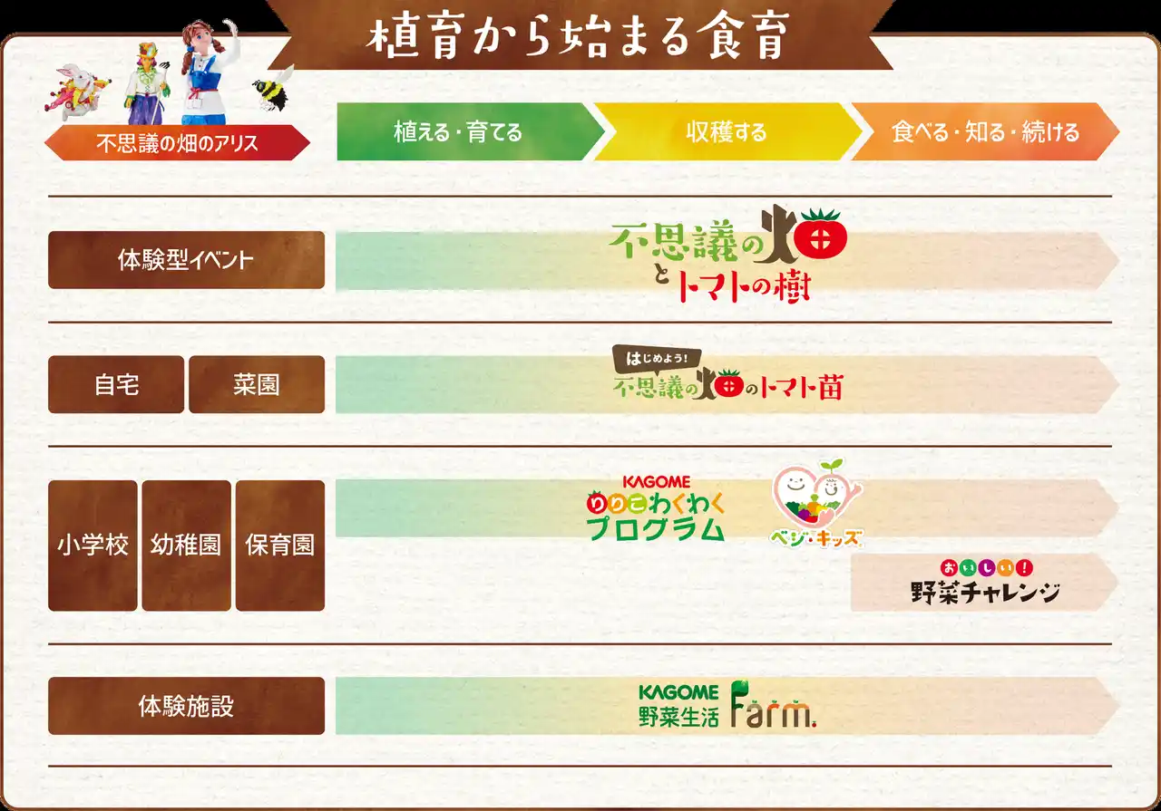 ※「トマトの苗」、「不思議の畑のアリス」の絵本、「トマトの収穫体験」、「カゴメの野菜飲料」は数に限りがあります。 |
