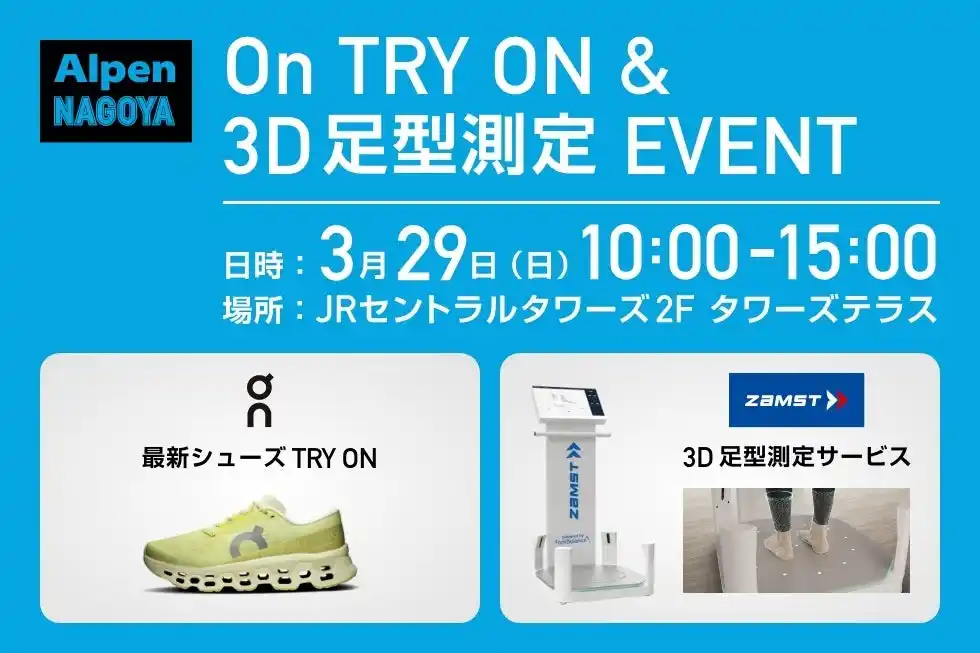 スポーツ用品販売の株式会社アルペン(本社:愛知県名古屋市、代表取締役社長:水野 敦之)が運営する「Alpen NAGOYA」は、2026年3月29日(日)、JRセントラルタワーズ2階「タワーズテラス」にて、人気スポーツブランド「On(オン)」、およびサポーターブランド「ZAMST(ザムスト)」と共同で、1日限定の体験型ランニングイベントを開催いたします。 |