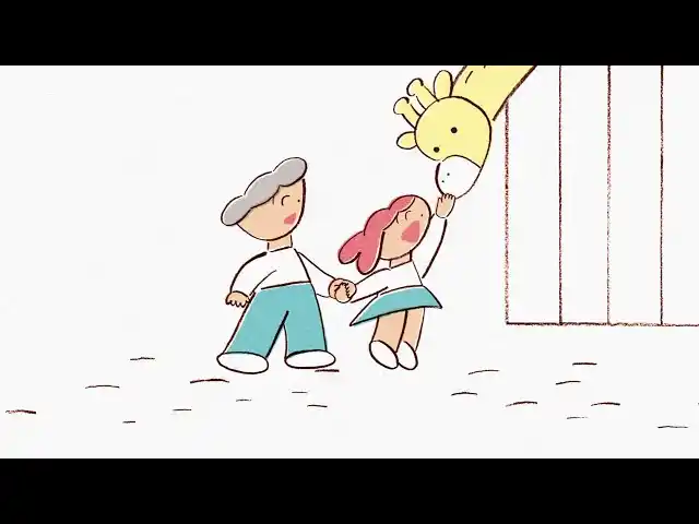 娘が前へ前へと歩んでいくのを後ろから手を握って見守っている父。動物園で背の高いキリンに出会ったり、季節が変わるとトンボが飛んできたり、世界は子どもにとって新たな出会いとときめきであふれています。次々と出会いにときめき夢中になる娘の成長を、父はつないだ手を離さずに後ろからそっと見守ります。月に照らされた暗い夜道では娘が父に肩車をおねだり。たとえ暗い道でも、前へ前へと親子は歩んでいきます。季節が変わって吐く息が白く染まる冬。親子は雪だるまを見つけると、寒さに負けずにつなぐ手でお互いを温めながら、歩みを進めていきます。 |