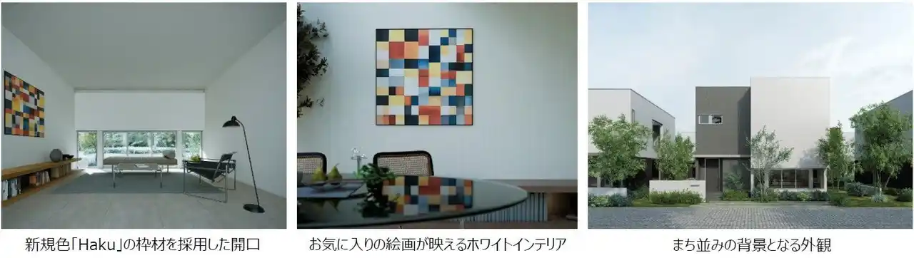 リビング・ダイニングは開口を南北のみに絞り、東西面は壁を広く残すように設計しました。建具や枠材は新規色「Haku(=白)」を採用することで境界のない白い壁面を演出しています。お気に入りの家具や照明、グリーンをコーディネイトして暮らしを楽しめる、ホワイトインテリアが特徴です。 |