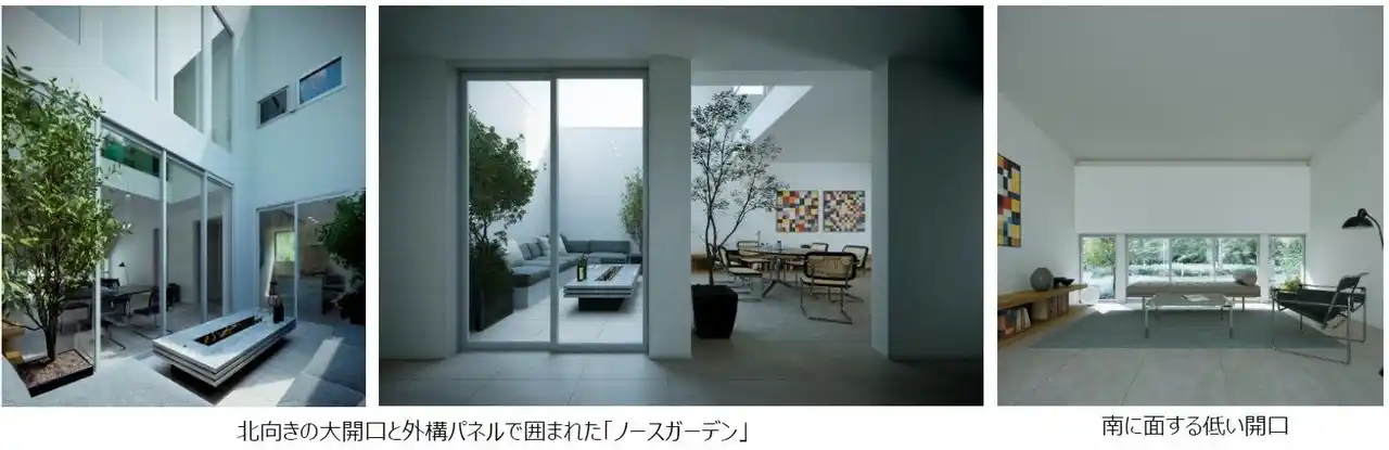 本プランの最大の特徴は、北側に大きく開いた窓と、外構パネルで囲まれた「ノースガーデン(北庭)」です。北向きの大開口は直射日光を避け、暑さ・眩しさを防ぐことができるため、カーテンを開けたまま一日を快適に過ごすことができます。南向きの開口でカーテンを併用する場合と同等の健康的な明るさ※1を、北向きの大開口でも十分に得られるというシミュレーション結果も出ています。※2また、外構パネルが周囲からの視線を遮るため、カーテンを閉めずに開放的に過ごせるプライベートな外部空間を実現。