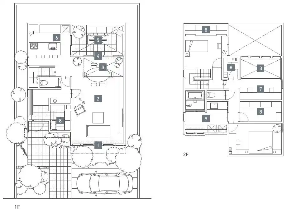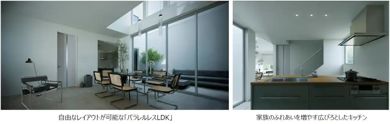 1階は大きなワンルームのパブリックスペース「パラレルレスLDK」。大開口に面して吹き抜けを設け、ノースガーデンともフラットにつながり、垂直・水平方向に広がりを感じさせる空間です。リビング・ダイニングには方向性を持たせず家具を自由にレイアウトすることで、住まい手が自分好みの居場所をつくることができます。 |