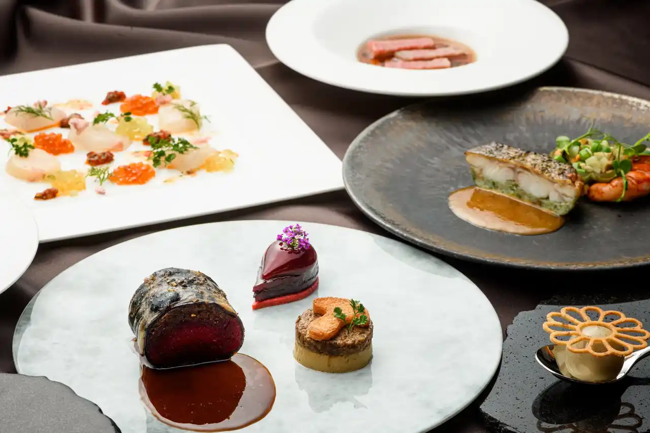 | コースの核となるメインディッシュは、フランス・アルザス地方をテーマに、鹿肉本来の旨味を生かしたシンプルかつ力強い構成。もみの木のリキュールを加えることで、アルザスの“森”を思わせる奥行きのある香りをほのかに表現しました。仕上げには、まろやかな塩味が特徴の鹿児島産フルール・ド・セルとミックスペッパーを用いて、味わいに立体感を持たせています。ガルニチュールには鹿の心臓や鹿児島の味噌を取り入れ、フランス料理に“和”の要素を融合。味覚と視覚の双方を刺激する唯一無二の一皿に仕上げました。ホテル最上階から望む雄大な景観とともに、特別なひとときをお楽しみください。 | |||||||||