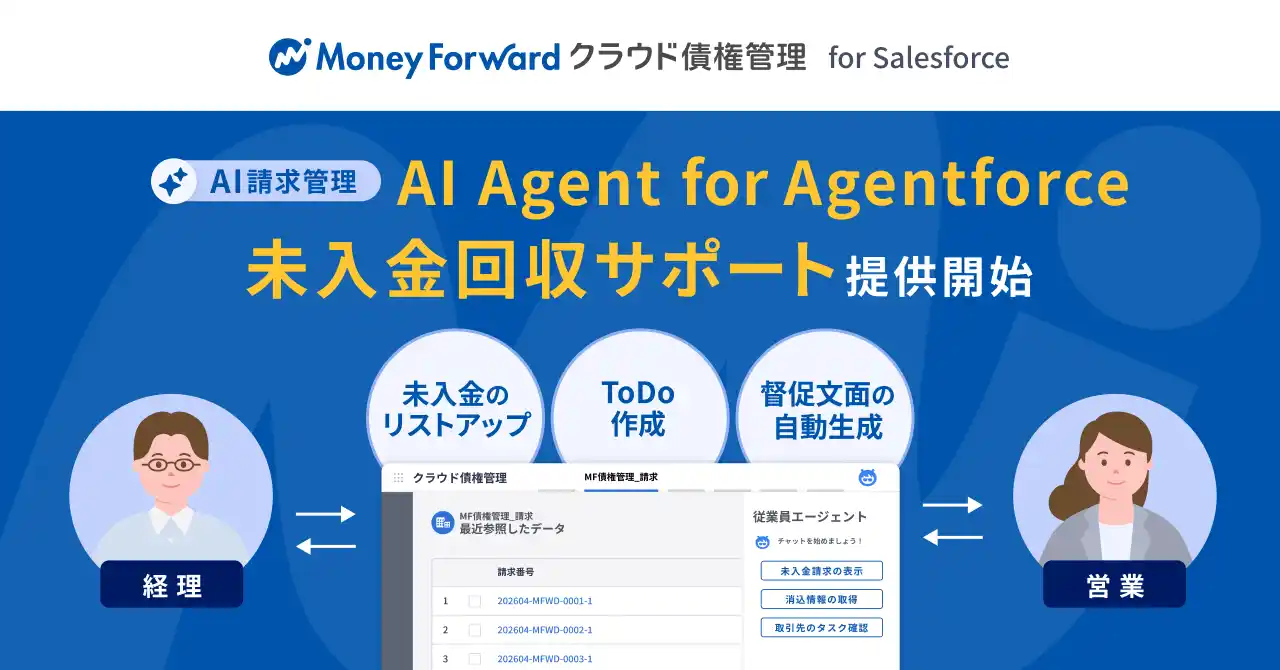 株式会社マネーフォワードは、『マネーフォワード クラウド債権管理 for Salesforce』において、Agentforce向けに新たな『AI Agent for Agentforce 未入金回収サポート』の提供開始を発表します。このサービスは、入金消込後の滞留債権解消をAIが自律的に支援します。 |