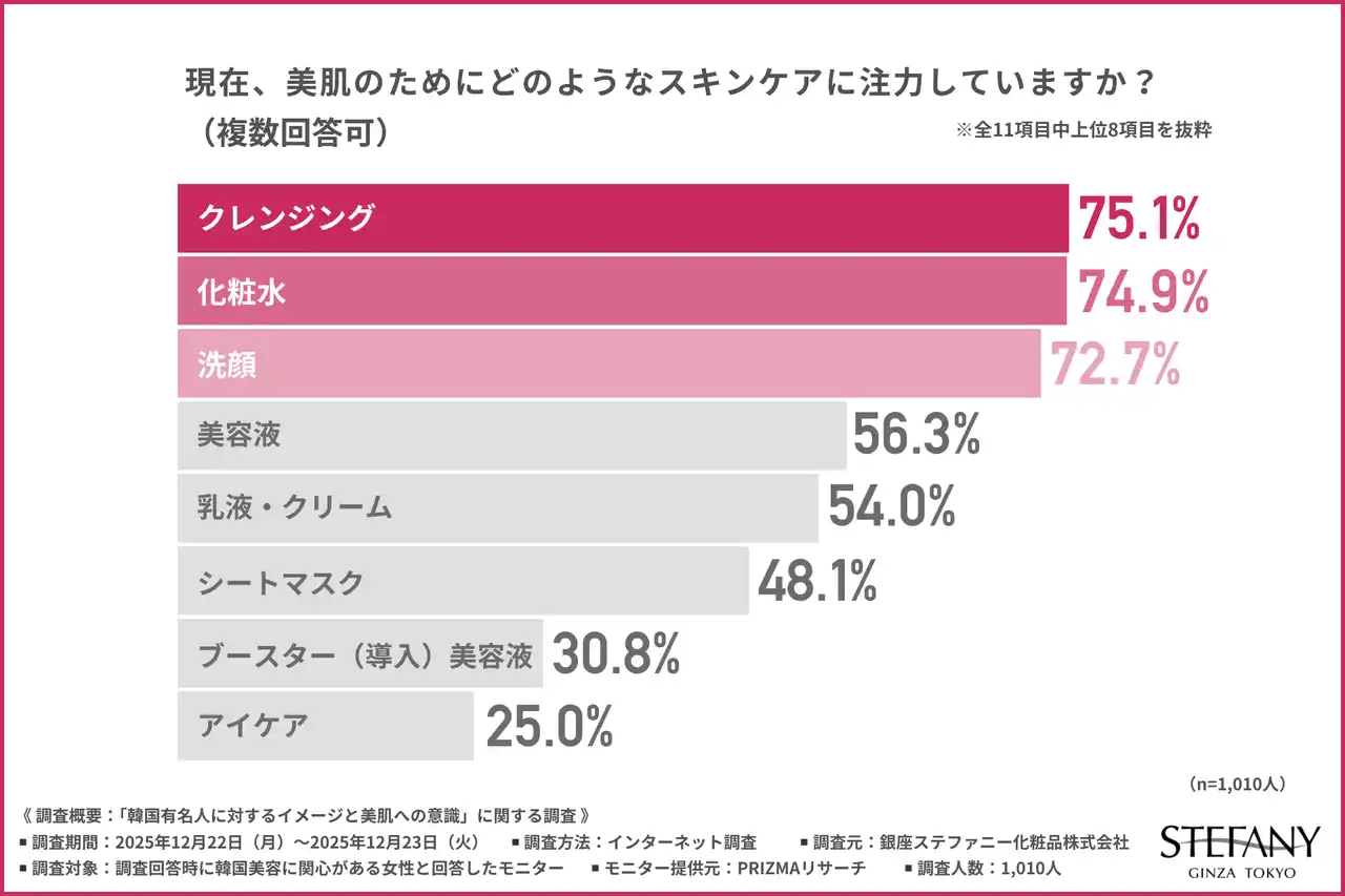 「現在、美肌のためにどのようなスキンケアに注力しているか」と質問したところ、『クレンジング(75.1%)』と回答した方が最も多く、『化粧水(74.9%)』『洗顔(72.7%)』となりました。 |