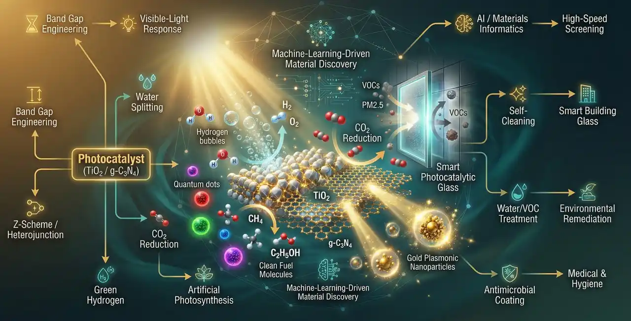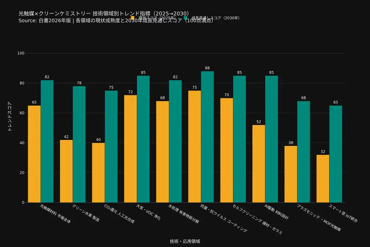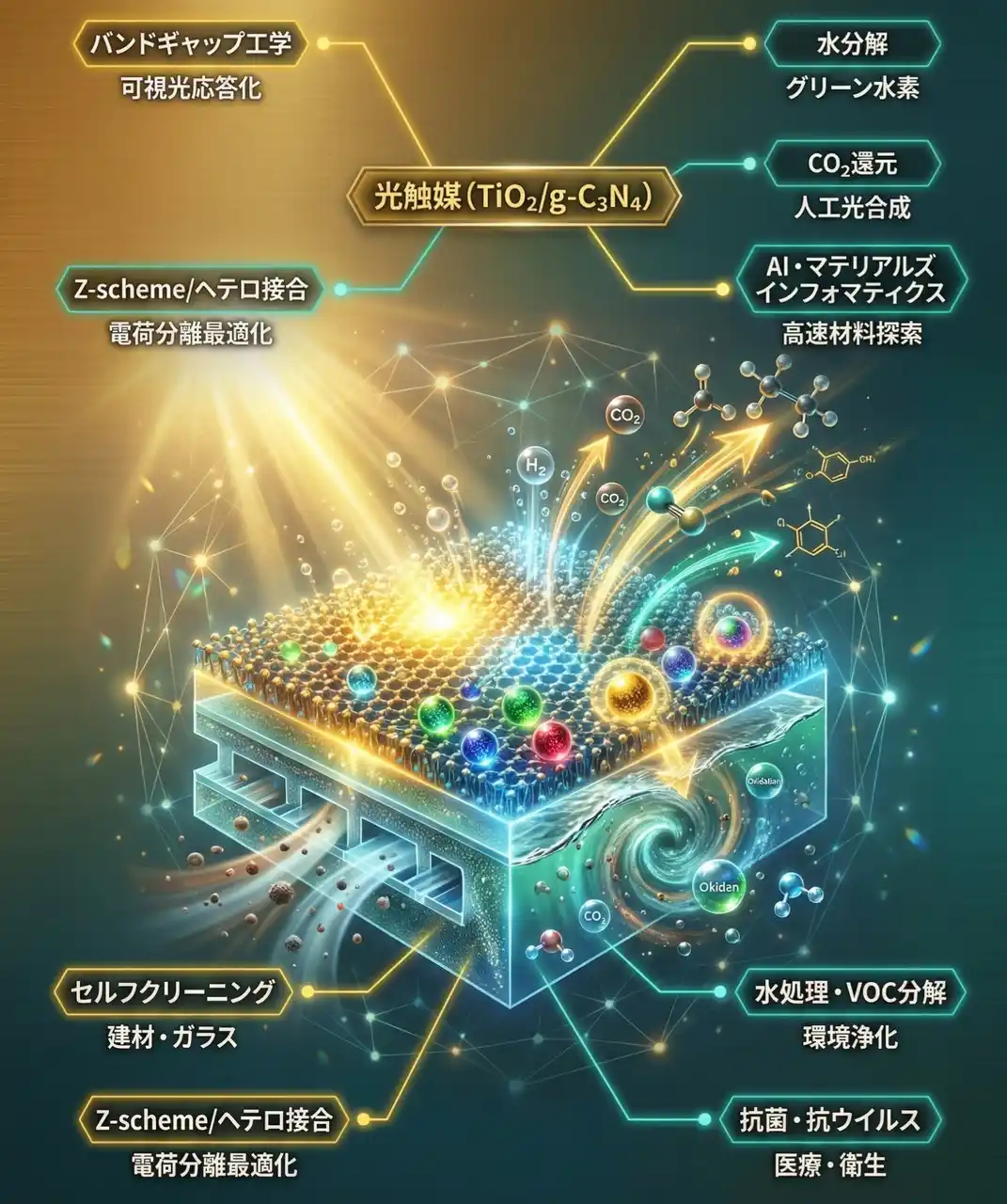 太陽光駆動CO2還元・共電解による高付加価値化学品(C2+)量産・IoT連携型自律スマートウィンドウ(光発電×光触媒×AI)など、次世代の社会インフラ構成要素として光触媒システムを設計・実装する段階に移行する。レアメタルフリー・リサイクル可能触媒・LCAを組み込んだサステナブルプロセス設計が、2035年以降の製品競争力の根幹となる。 |