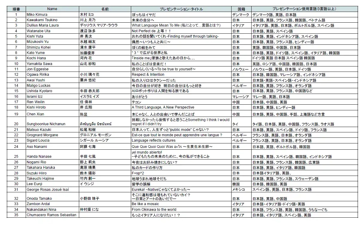 日本、マレーシア、韓国、中国、タイ、イタリア、ノルウェー、ベルギー、デンマーク、メキシコの留学生を含む35人の本選出場が決定しました。