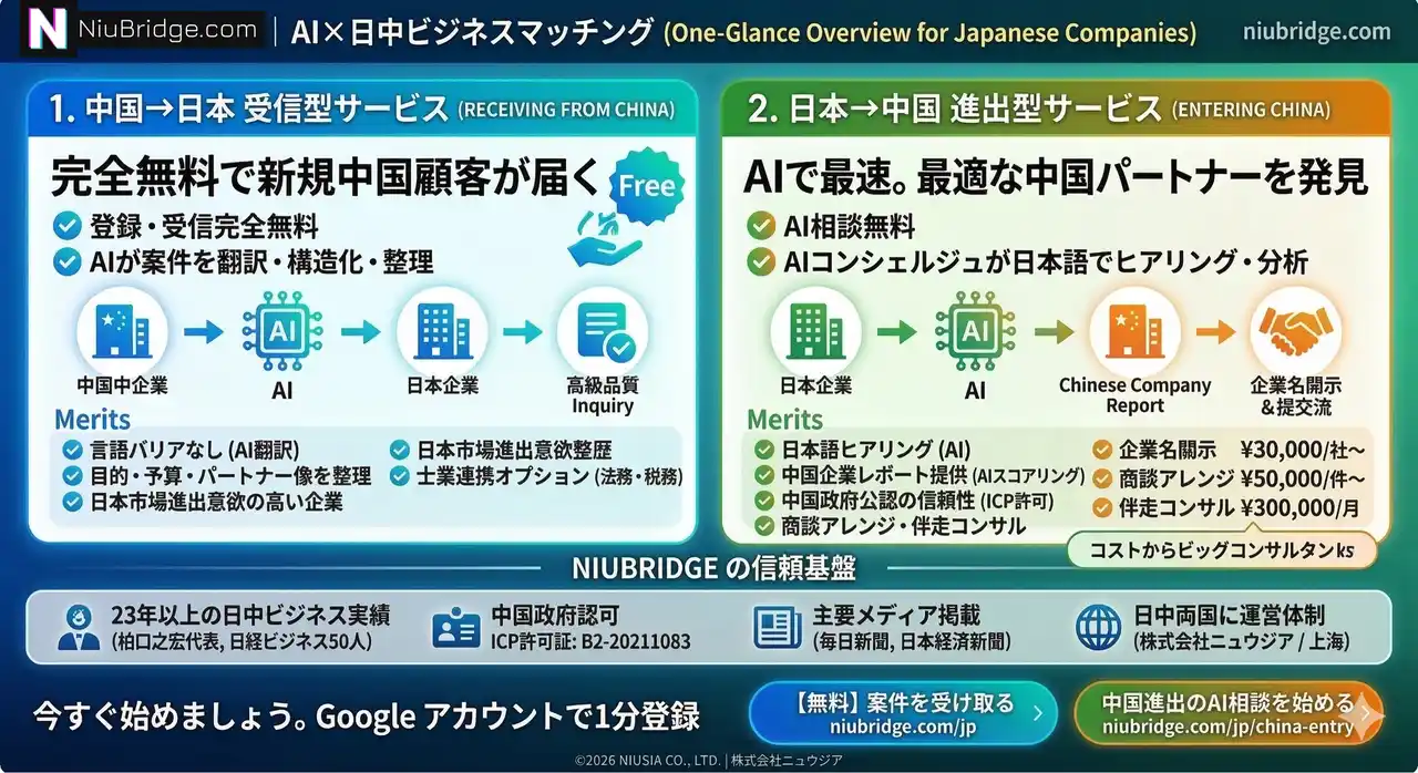 | 株式会社ニュウジア(本社:東京都中央区、代表取締役:柏口之宏、以下「ニュウジア, NIUSIA」)は、2026年 3 月16日より、AI を活用した日中ビジネスマッチングプラットフォーム | ||||||||||||||||||