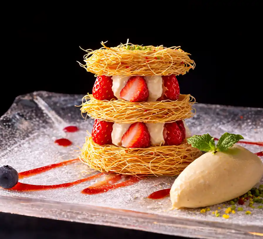 さらに2004年のオープン当初から提供する人気デザート『ジョエル・ロブションのミルフィーユ ~天使の髪をつむいで~』を、“とちあいか”を使った新作としてご用意いたします。香ばしく焼き上げたカダイフに“とちあいか”と、マスカルポーネと生クリームの軽やかなクリームを重ねました。サクサクの生地と苺、コクのあるクリームの調和をお楽しみいただけます。是非この機会に期間限定デザートをお楽しみください。 |