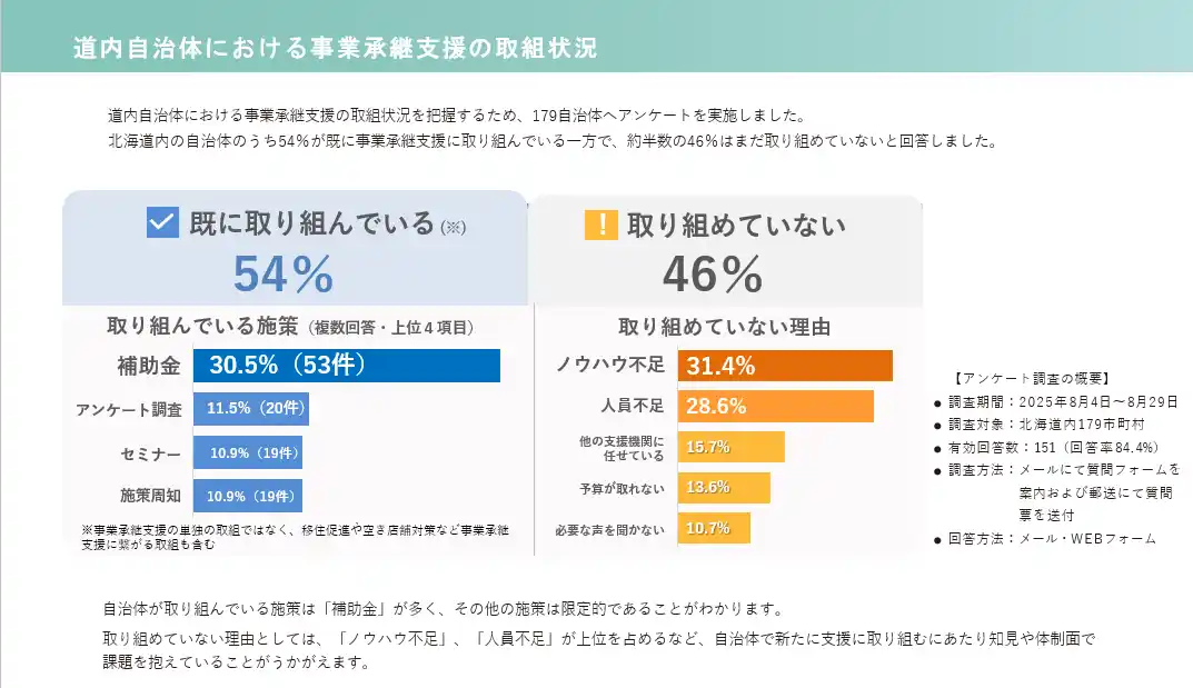 道内自治体の46%が事業承継支援に取り組めていない※1 ことから、支援に取り組む際の手法や道 |
