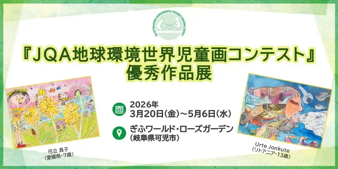 一般財団法人日本品質保証機構(東京都千代田区、理事長:石井 裕晶、略称:JQA)と国際認証機関ネットワーク(スイス・ジュネーブ、略称:IQNET)が主催する「JQA地球環境世界児童画コンテスト」の優秀作品展を、2026年3月20日(金)~5月6日(水)まで「ぎふワールド・ローズガーデン」で開催します。 |