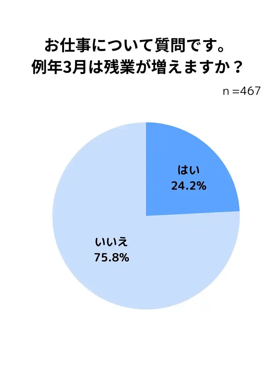 ●お仕事について質問です。例年3月は残業が増えますか?という設問には、約4人に1人の24.2%の方が「はい」と答えました。 |
