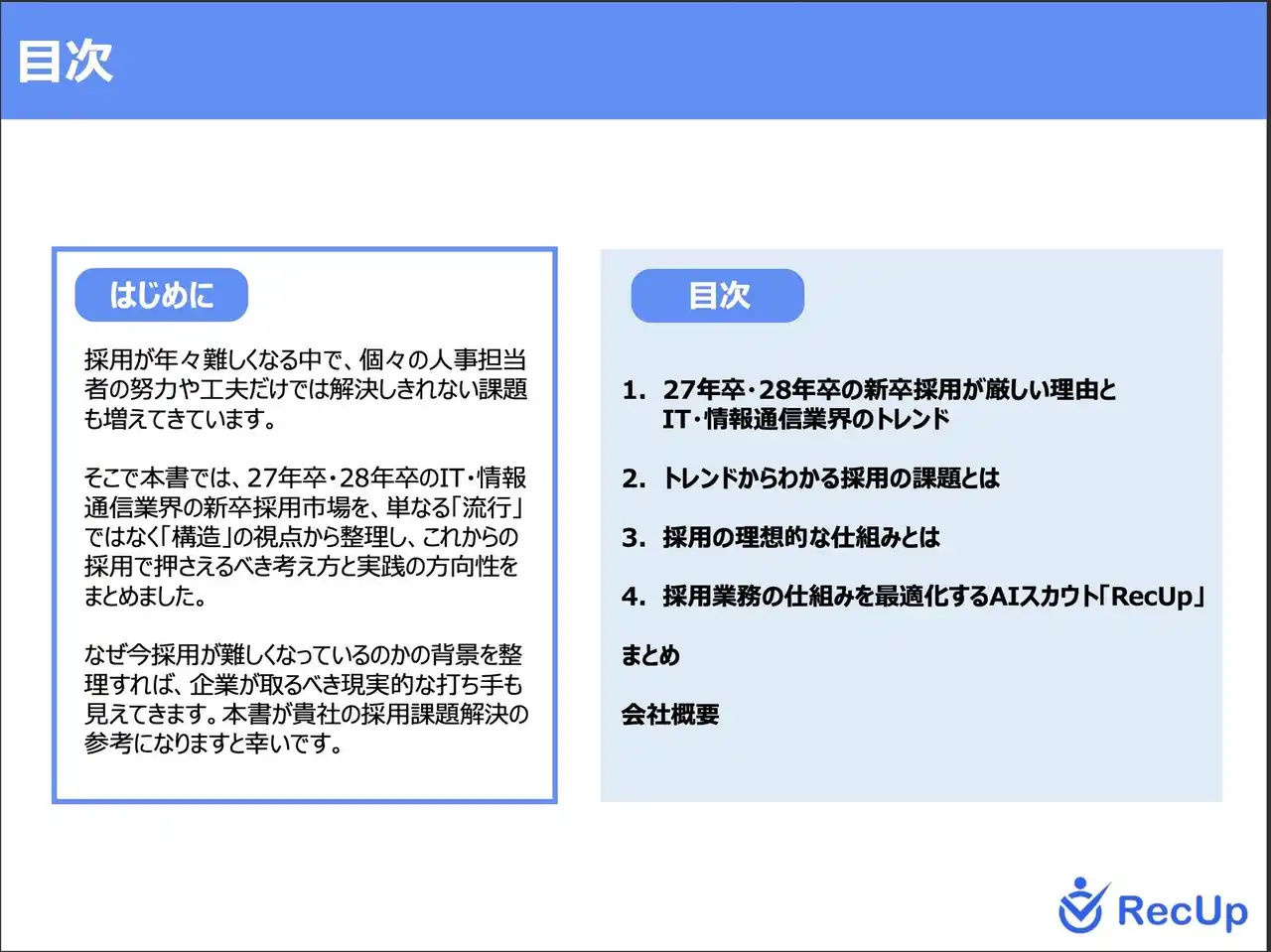 本資料では、激化するIT・情報通信業界の新卒採用市場において、いま選ばれる企業は何が違うのか。RecUp導入企業が実践する、最新トレンドを捉えた戦略的スカウト運用の全容を公開します。 |