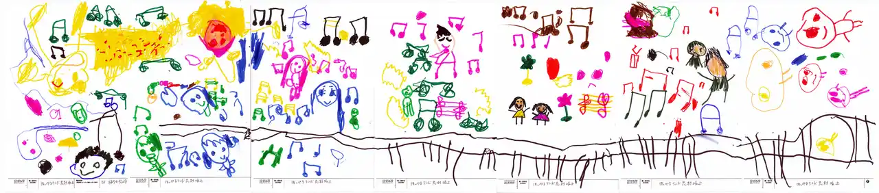 | 年長さんが発表会で歌った歌を口ずさみながら幼児クラスみんなで描きました!1人が音符を描くとまわりの子も「わたしもかけた!せんせいみて!」とつながっていく様子が音楽のすばらしさを教えてくれました。ピアノがきたら先生だけがひくのではなく子どもたちも楽しめるようにしたいです。 | |||