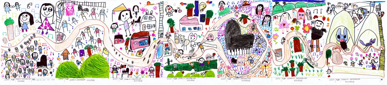 | 年長児、風ぐみの子どもたち21名全員で描きました。大きなピアノを中心に道が伸び、そのまわりでは、たくさんの子どもたちが笑顔いっぱいで音楽を奏でています。そして、いつもお散歩で訪れる身近な風景もたくさん登場し、子どもたちの「大好き」がぎゅっと詰まったとってもかわいらしい作品になりました。音楽と日々の思い出が広がるあたたかく素敵な一枚です。ピアノが届いたら、ピアノを囲んでみんなの大好きな歌をたくさん歌いたいです。 | |||