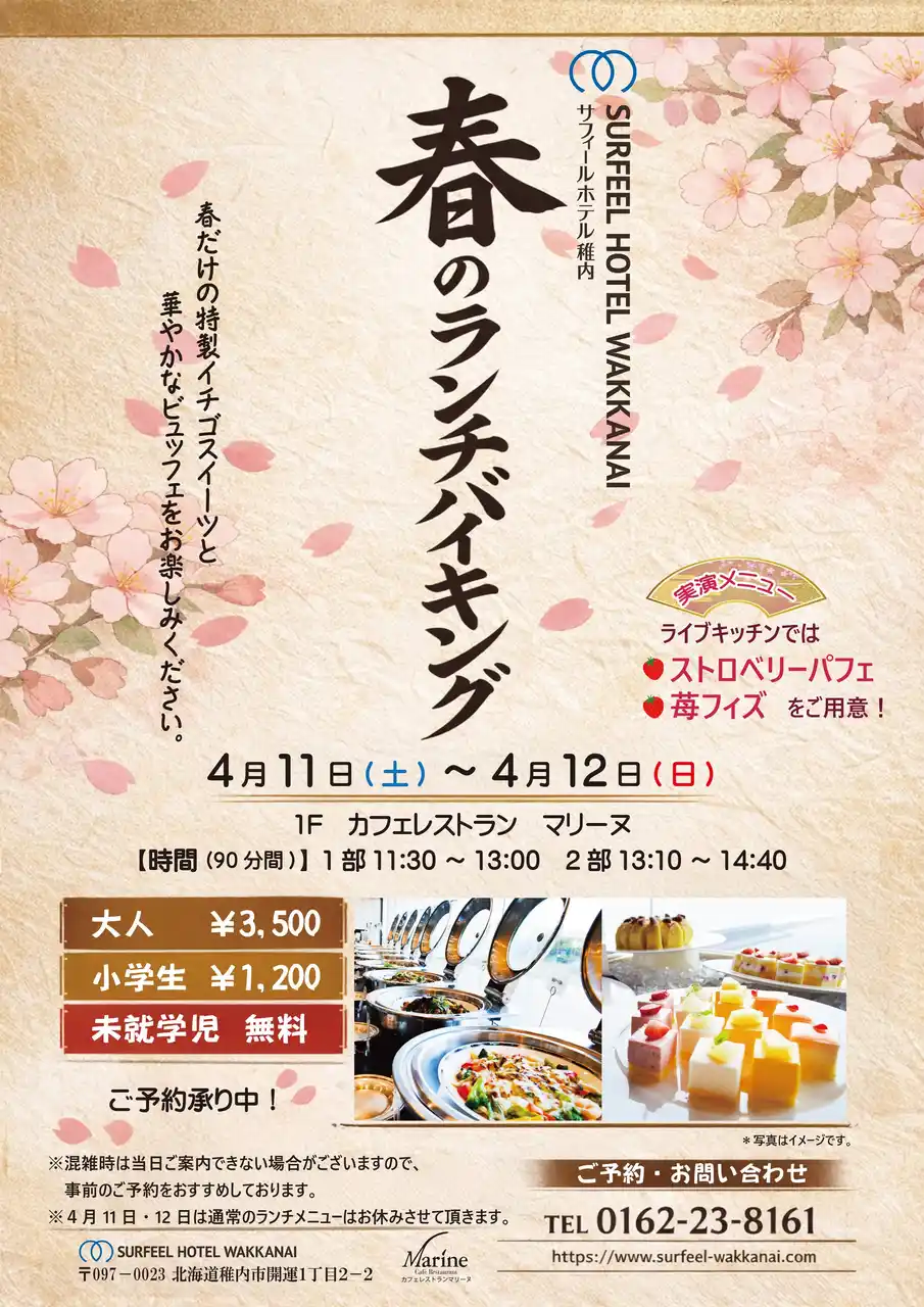 | サフィールホテル稚内(北海道・稚内市)では、春の味覚“いちご”を心ゆくまで楽しめるランチバイキング を2026年4月11日(土)・12日(日)の期間限定で開催いたします。 | |||