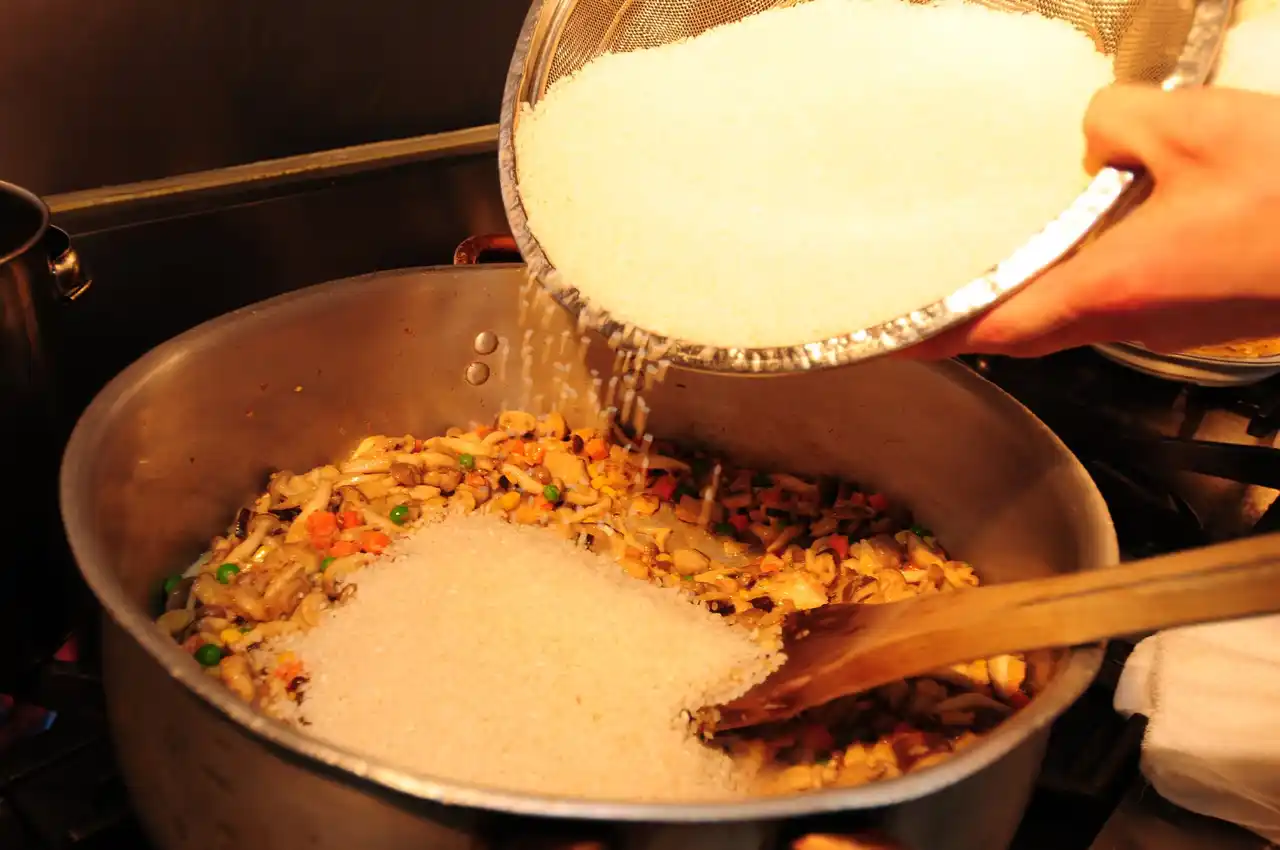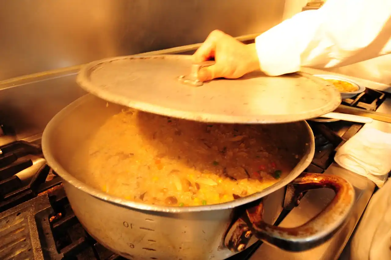 こうすることで米の芯まで味がしみ込み、旨味が十分に広がります。 また適度に水分が飛ぶことでソースとの絡みもよくなります。 |