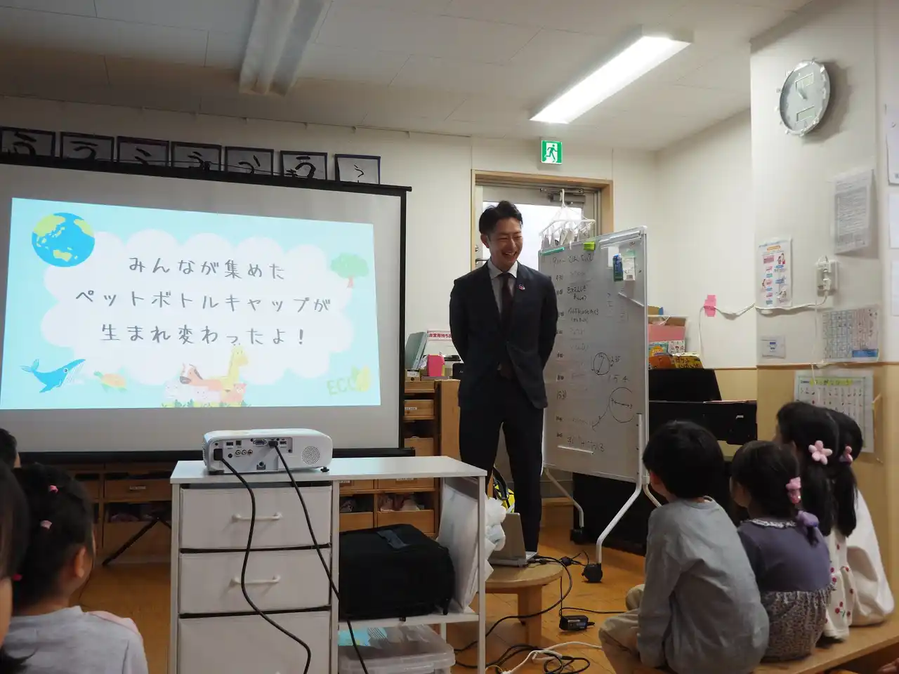 環境学習では、日本山村硝子のご担当者様より、園児たちが集めたペットボトルキャップがどのように回収・分別され、リサイクルされてプランターへと生まれ変わるのかを、スライドショーを交えながら分かりやすく説明いただきました。 |