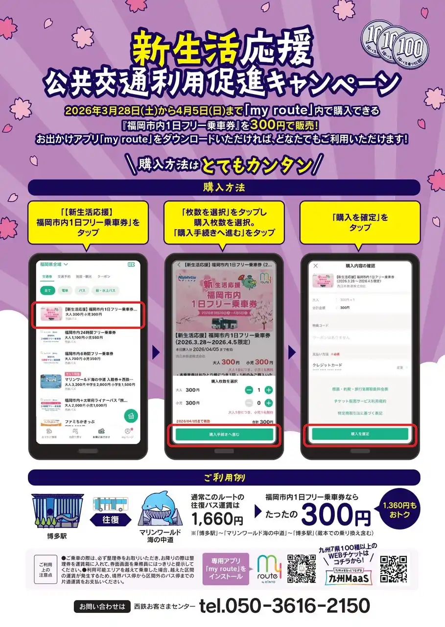 本キャンペーンを通じて、福岡で新生活を始められる皆さまに西鉄バスをご利用いただき、福岡市内における公共交通の利便性を体感いただくとともに、「my route」が提供するスムーズで便利な移動体験をお試しいただきたいと考えております。 |